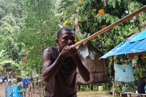 koud krijgt als zo’n boot snelheid maakt en jij kletsnat bent. Kletsnat waren we toch wel geworden, zonder de capriolen van de bootsman, die slingerend door de stroomversnellingen stoof, waarbij het water overvloedig over ons heen kwam, want het regende pijpenstelen toen we vertrokken. Onze enige echte regendag tot nu toe. Tja, je bent in een regenwoud of niet. Het bezoek aan het dorpje was een typische toerist trap maar toch wel interessant omdat we uitleg kregen over de leefwijze van deze semi-nomaden. Vooral het demonstreren van het jagen met een blaaspijp en vuur maken vond ik boeiend. Een geoefende jager schiet met z’n blaaspijp op 40 meter afstand een aap uit de boom. Ik moest wel even aan onze jeugd denken, toen we ook met een stuk elektriciteitspijp en een papieren pijltje op elkaar schoten. Of op openstaande ramen. Of op …… Nooit geweten, dat iemand het had afgekeken van dit soort stammen. Het was vooral een paar uurtjes lol,, maar toch wel heel wat anders, dan ons voor ogen stond.